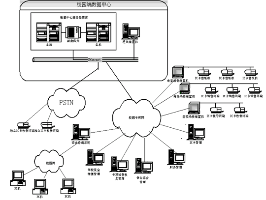 食堂餐饮消费应用子系统(可包括食堂、商店、浴室、电影院等的消费)在食堂和稍大一点的商店,采用消费前置机加消费终端的模式,即整个食堂或商店有一台消费前置机连接所有的消费终端,负责采集消费数据,把数据收集到结算中心,插入数据中心的数据库。消费终端和消费端前置机之间通过电缆直连,消费端前置机和数据中心结算服务器之间通过校园网连接。