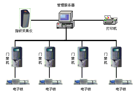 指纹门禁系统的硬件部分由指纹采集仪、门禁机、PC机、电子门锁、打印机、RS485连接网等组成。
