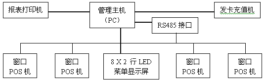 本系统是基于感应式智能卡(Contactless Smart Card)技术和自动控制技术的计算机网络系统。由PC主机、通过RS485接口连接的窗口售饭POS机、运行于PC主机的配套管理软件、与主机相连接的感应式智能卡读写机(充值机)、感应式智能卡和网络连接电缆等组件构成。配置1台标准并行口打印机,用于打印各种记录和报表。建议配置LED菜单显示屏和卡个人化制作设备。系统结构如下图: