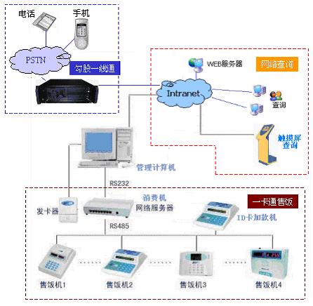 勾股非接触式ID卡消费管理系统,如图1,是当前最先进的收费、食堂售饭管理系统。它采用了射频识别这一尖端技术,并结合现代管理方法设计而成。具有免接触、无损耗、技术先进、系统扩展性好、无需维护投资一步到位等优点,避免了因接触式IC卡的读写、油污、芯片裸露等缺陷造成的各种故障,并明显的减少了使用现金或饭菜票所带来的交叉感染,避免了饭菜票的流失。 勾股非接触式ID卡消费管理系统,是广大学校、企事业单位提高管理水平,实现电脑化的最佳选择。系统可同考勤机、门禁机、巡更机等产品实现一卡通管理,系统也可以与勾股家长学校一线通连接实现电话查询,系统还可以WEB连接实现网络查询。